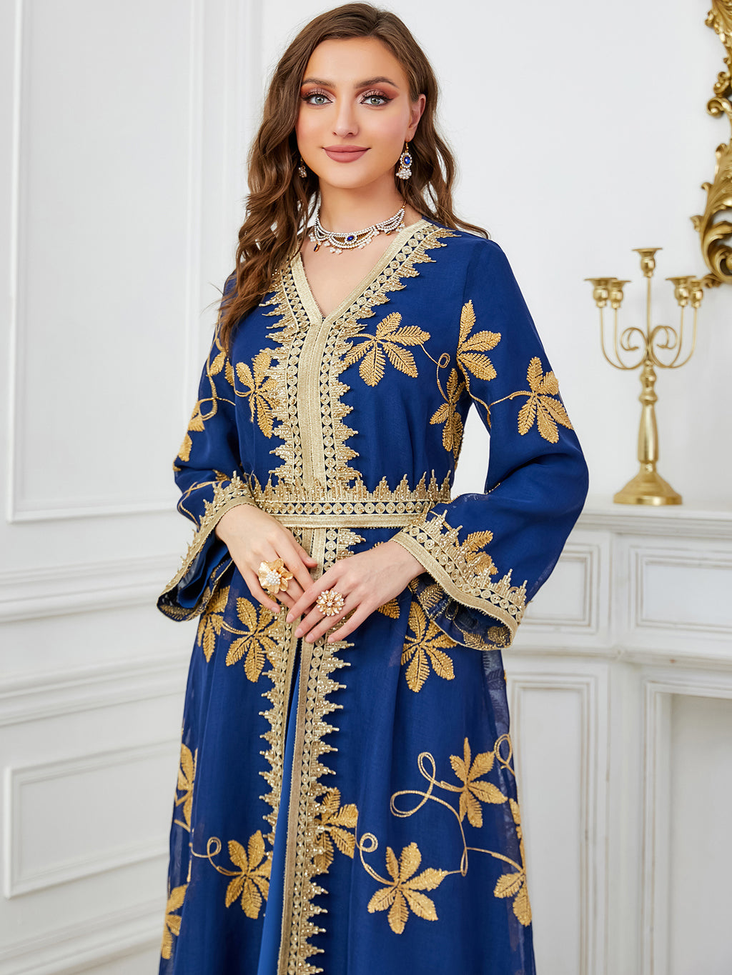 Complete your wardrobe wearing the Women's Long Sleeve White and Gold Leaf Print Dress. It is finished off with gold trim along the sleeves and down the front.