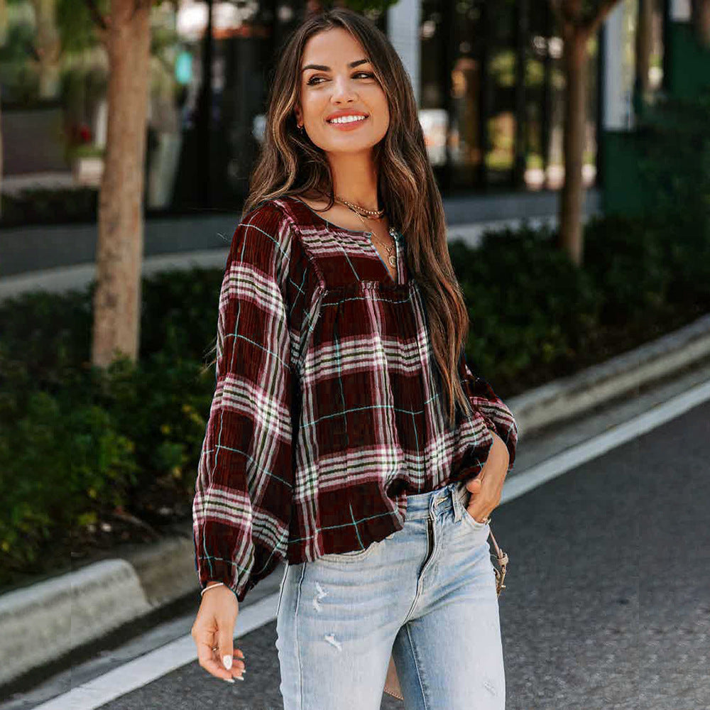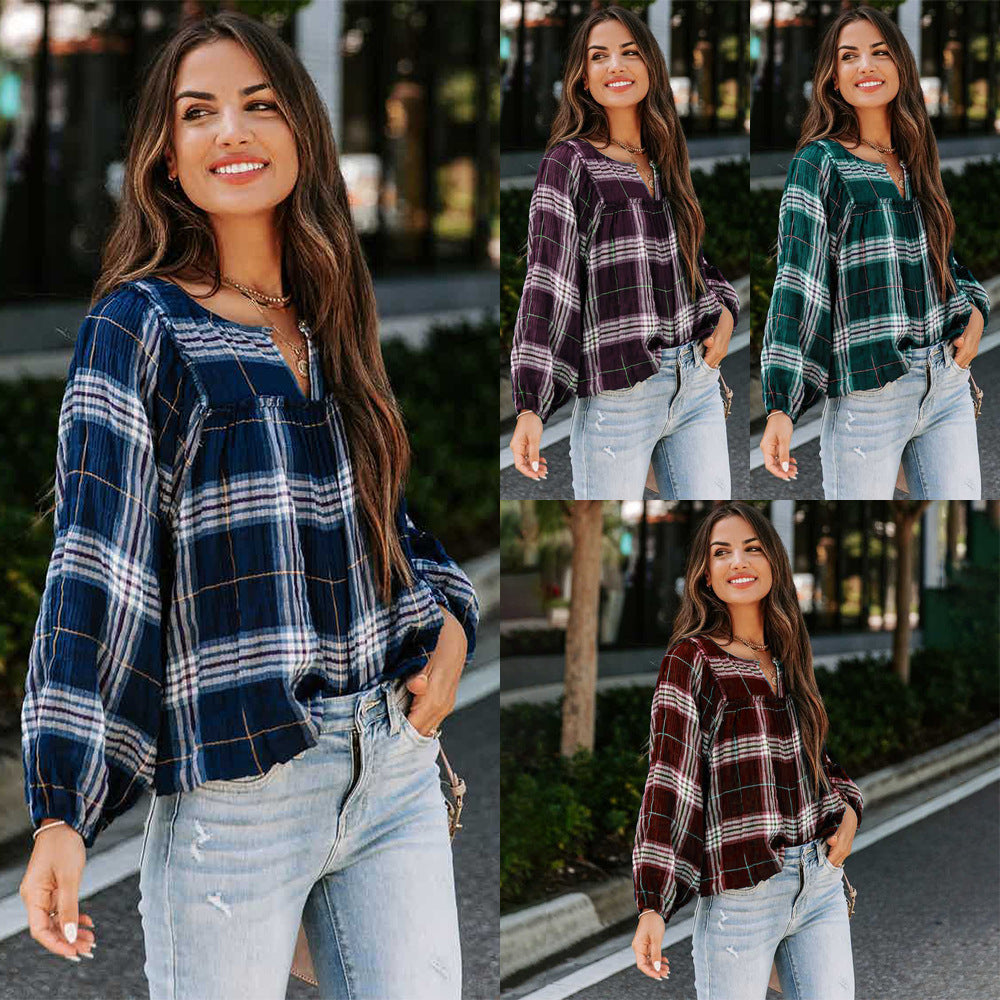 वी-नेक के साथ गर्म प्लेड लंबी आस्तीन शर्ट