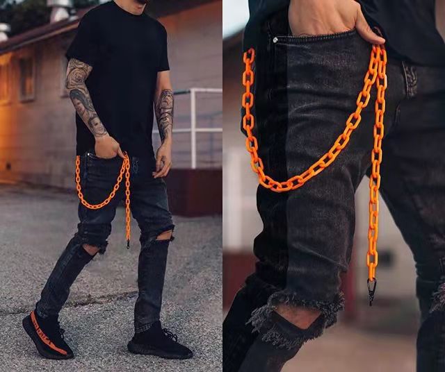 Catch the eye of passersby on the street wearing the attention grabbing Men’s Skinny Jeans with Ripped Knees and Vibrant Orange Chain that are sure to turn heads.