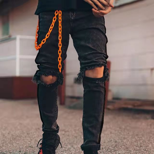 Men’s Skinny Jeans with Ripped Knees and Vibrant Orange Chain