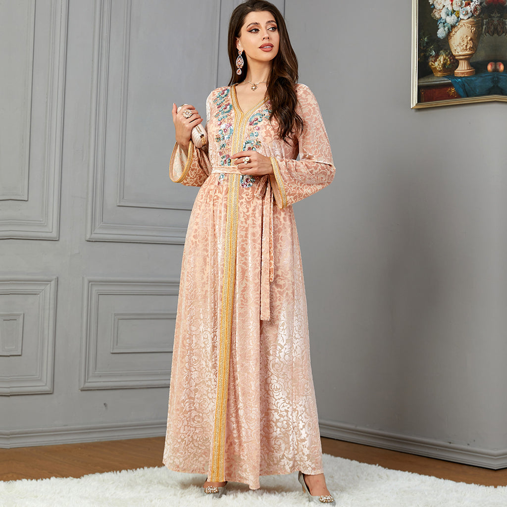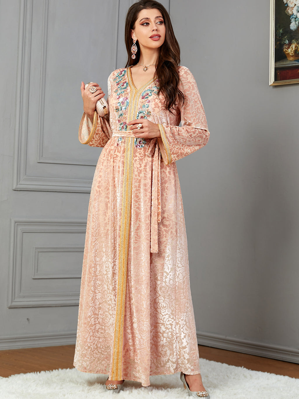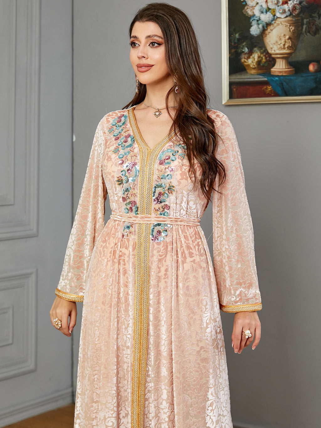 Delicaat en sierlijk, de champagne en blauwe maxi -jurk van de dames, bevat blauwe bloemendetails langs het lijfje en een taille van de lint.