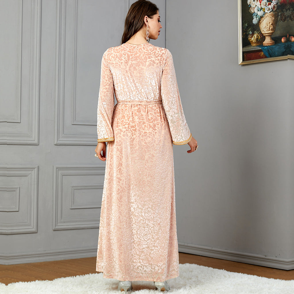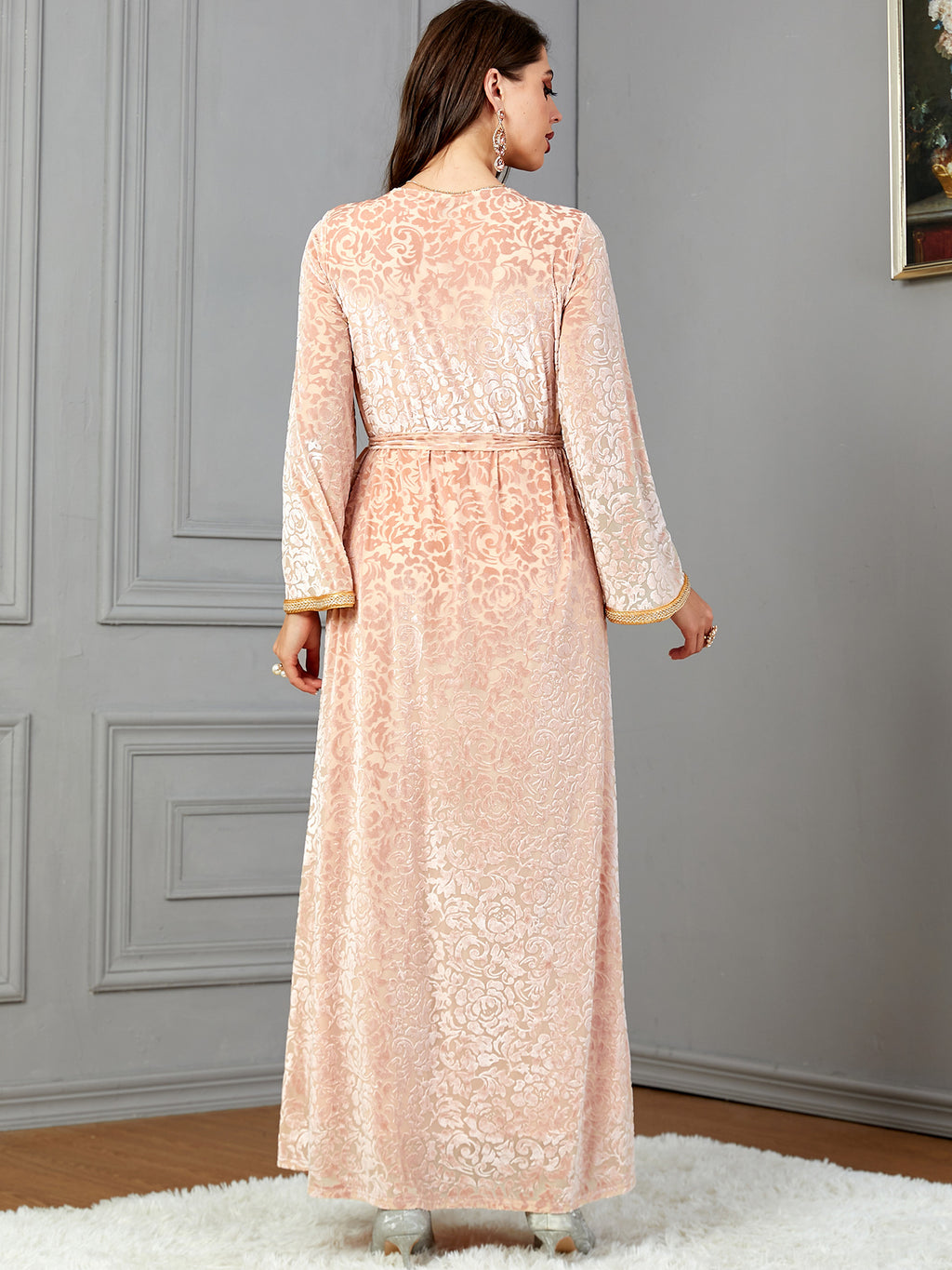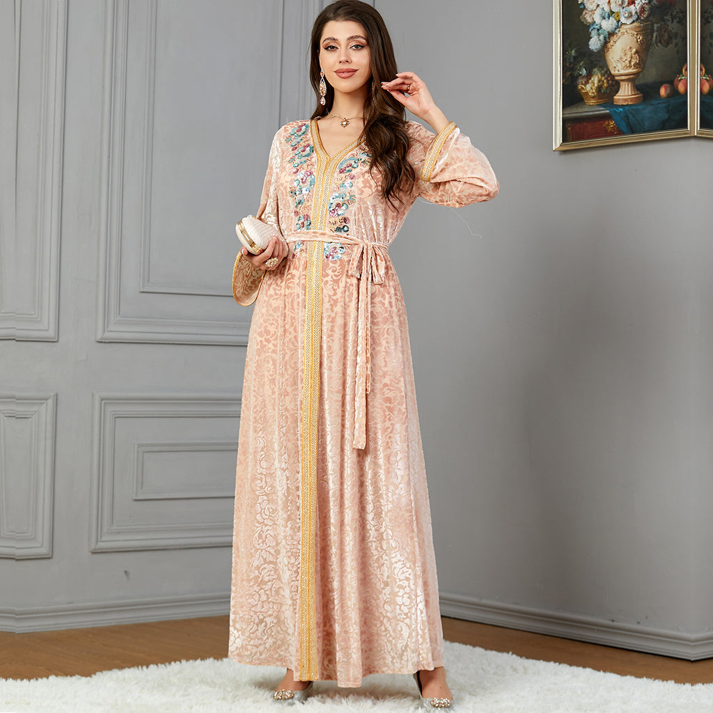 Delicaat en sierlijk, de champagne en blauwe maxi -jurk van de dames, bevat blauwe bloemendetails langs het lijfje en een taille van de lint.