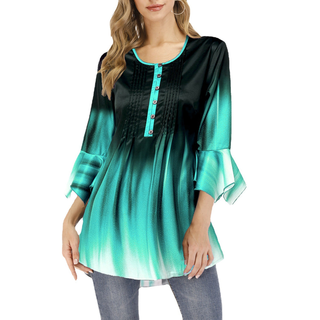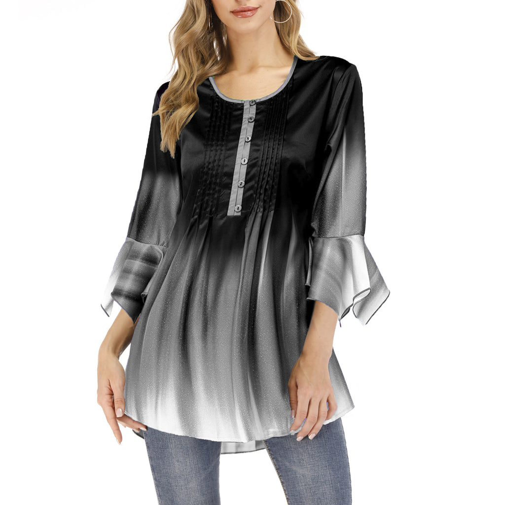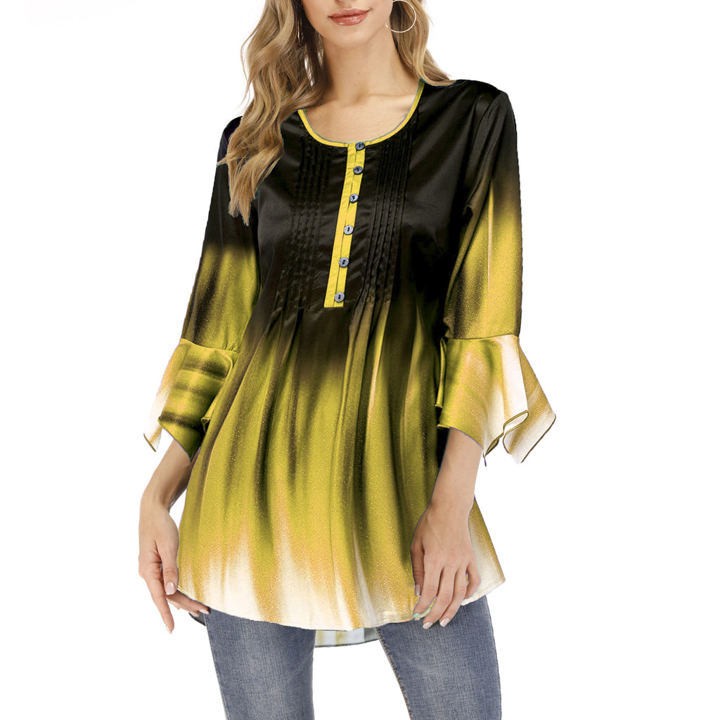 Stand out with the dramatic look of the Women's Long Sleeve Lightweight Ombre Shirt with Bell Sleeves. The top features mock buttons down the neck to give it added detail.
