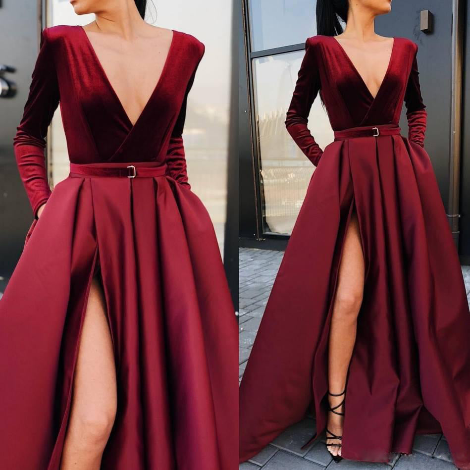 Make a grand entrance wearing the Women’s Long Sleeve Ball Gown with Belted Waist. This rich crimson dress featuring a low V-neck and has a thigh slit in the billowy skirt.