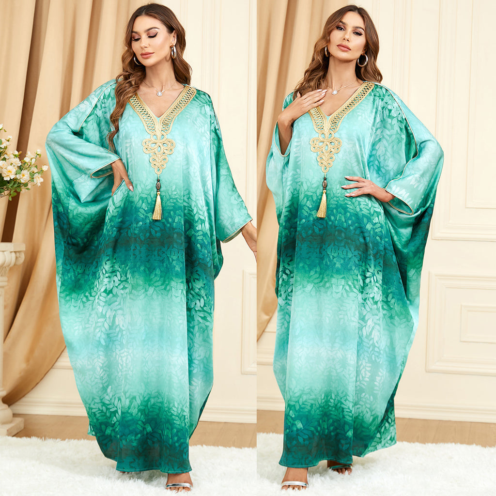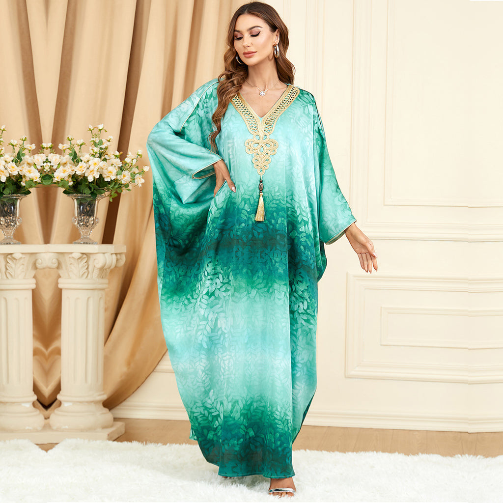 Shimmer and shine with the Women's Ombre Green Long Sleeve Gown featuring a golden design along the bodice and a matching golden tassel.