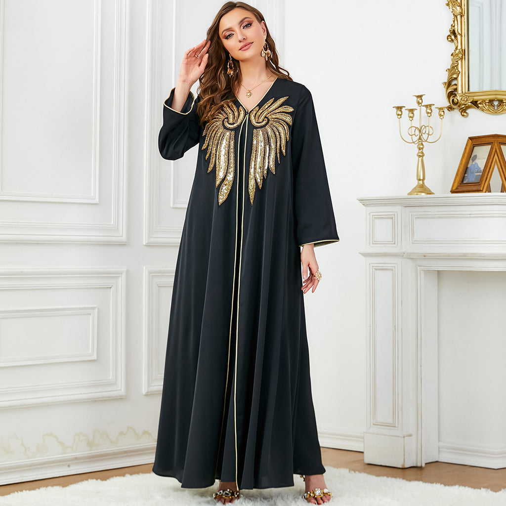 Feel like royalty in the Women's Long Sleeve Loose Fitting Navy Blue Robe Dress accented with shimmery golden details and matching gold trim.